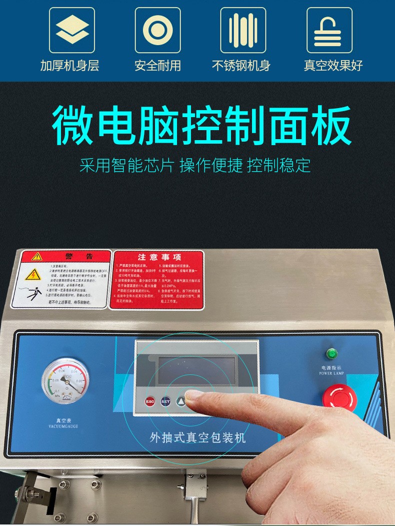 外抽真空包裝機主要通過外部的真空泵來抽取包裝容器(通常是真空袋)內的空