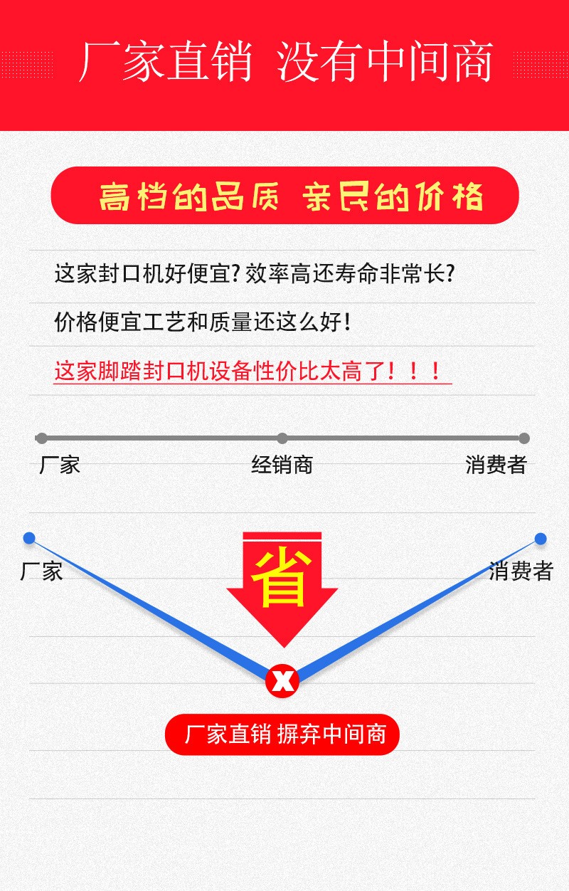 - 價(jià)格相對較低:相比一些自動(dòng)化程度高、功能復(fù)雜的封口機(jī),腳踏封口機(jī)的結(jié)構(gòu)簡單,成本較低,價(jià)格也比較實(shí)惠。這使得它在一些預(yù)算有限的用戶中具有較高的吸引力。
