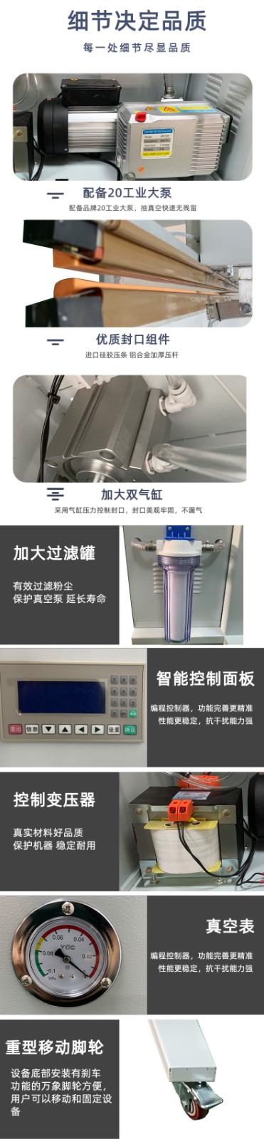 - 電子元件:芯片、電容、電阻等微小電子元件,對(duì)儲(chǔ)存環(huán)境要求嚴(yán)苛,需防潮、防氧化、防靜電。真空包裝提供了潔凈干燥的空間,機(jī)器的可升降性方便處理不同高度的元件包裝盒,保障元件性能不受外界環(huán)境干擾。