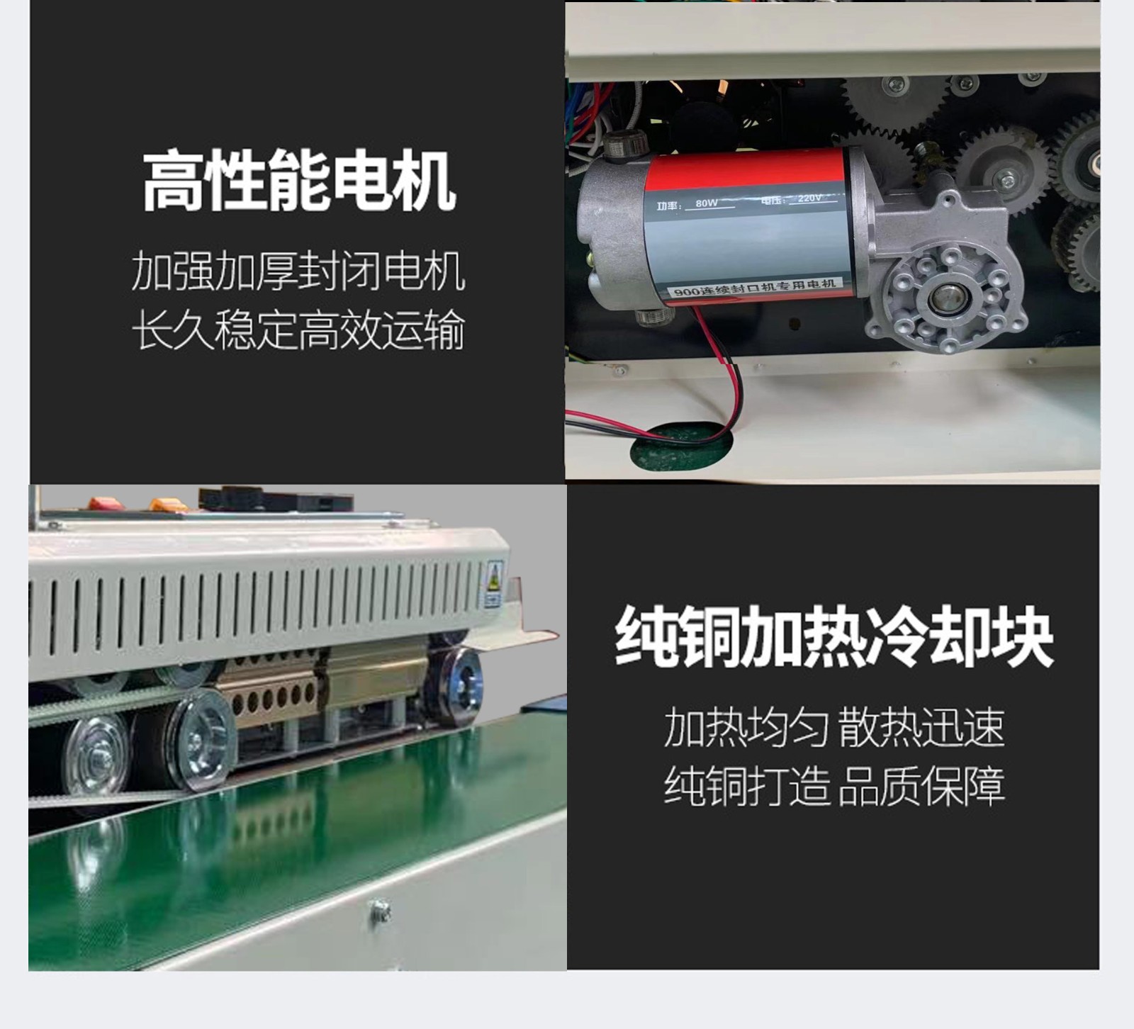 輸送系統(tǒng):由電機(jī)、皮帶、滾輪等組成,負(fù)責(zé)將待封口的包裝袋連續(xù)輸送至封口位置,并且可以通過(guò)調(diào)速裝置控制輸送速度,以適應(yīng)不同的生產(chǎn)需求。