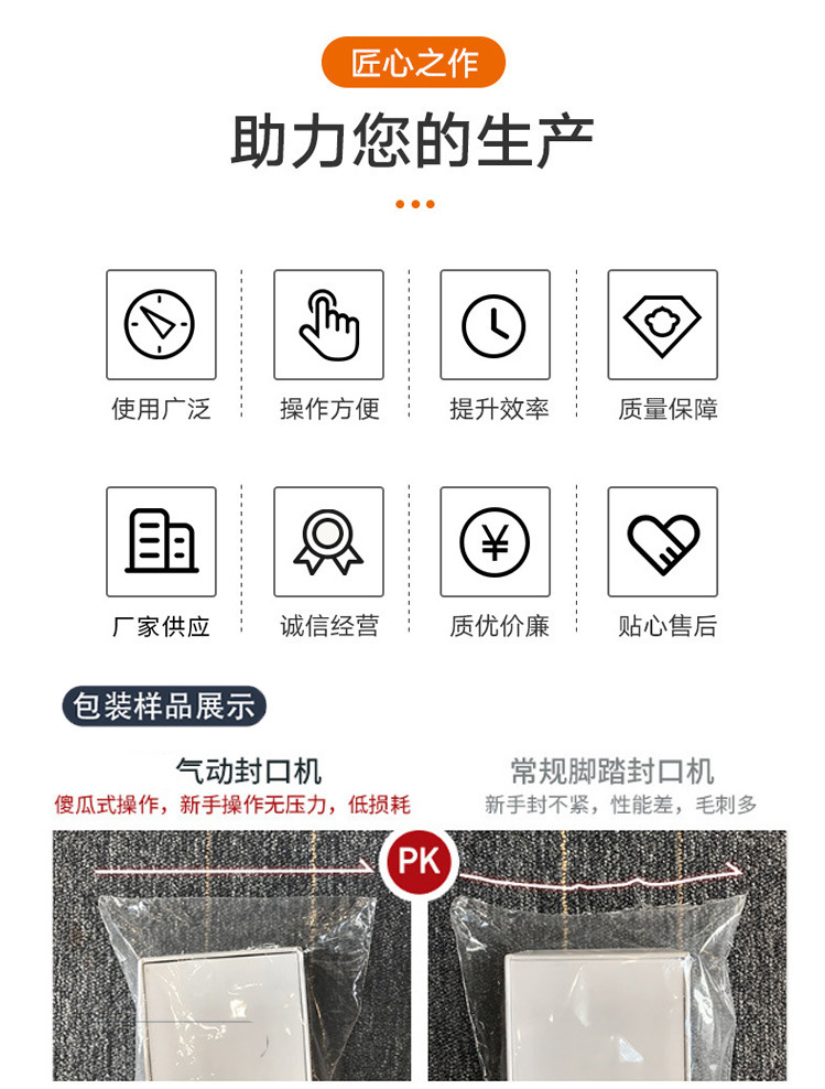 - 正常使用:將袋口拉平放入機(jī)器,踩下腳踏板進(jìn)行封口 。