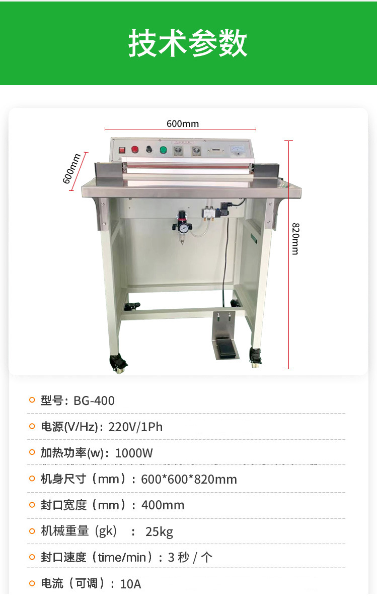 以常見的腳踏封口機(jī)為例,封口長度可達(dá) 450mm,封口寬度為 5MM,脈沖功率為 1.4KW,外形尺寸為 500×400×900mm 。