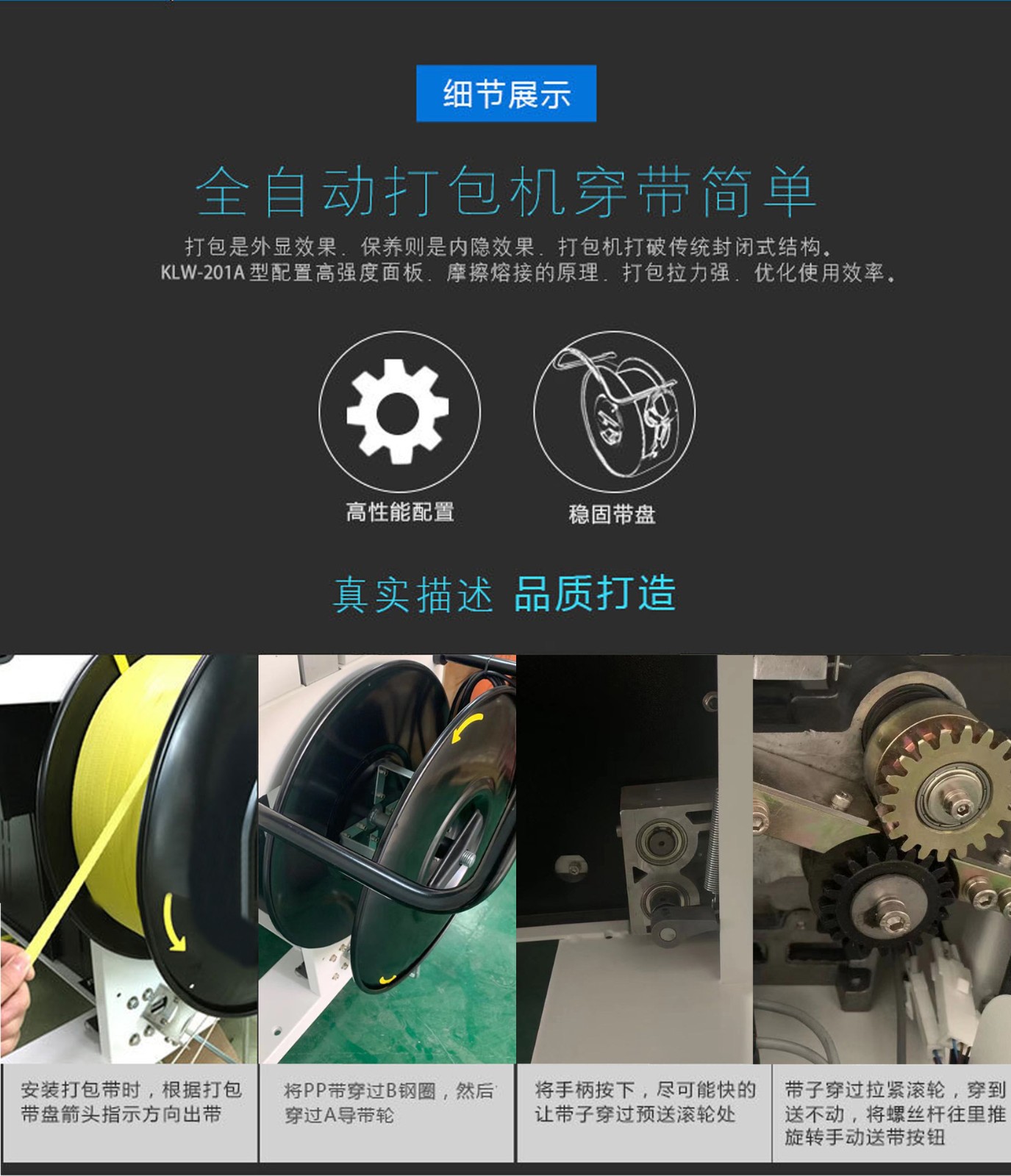 - 自動(dòng)打包機(jī)主要依靠機(jī)械傳動(dòng)與控制系統(tǒng)協(xié)同作業(yè)。將物品放置在指定位置后,通過傳感器感知,啟動(dòng)電機(jī)運(yùn)轉(zhuǎn),帶動(dòng)送帶、拉緊、切帶等一系列動(dòng)作。送帶輪把打包帶從帶盤輸送至待打包物體周圍,隨后拉緊裝置發(fā)力,讓打包帶緊緊束縛物品,最后切帶裝置精準(zhǔn)切斷打包帶,一個(gè)打包流程就此完成 ,部分高端機(jī)型還具備自動(dòng)貼標(biāo)功能。