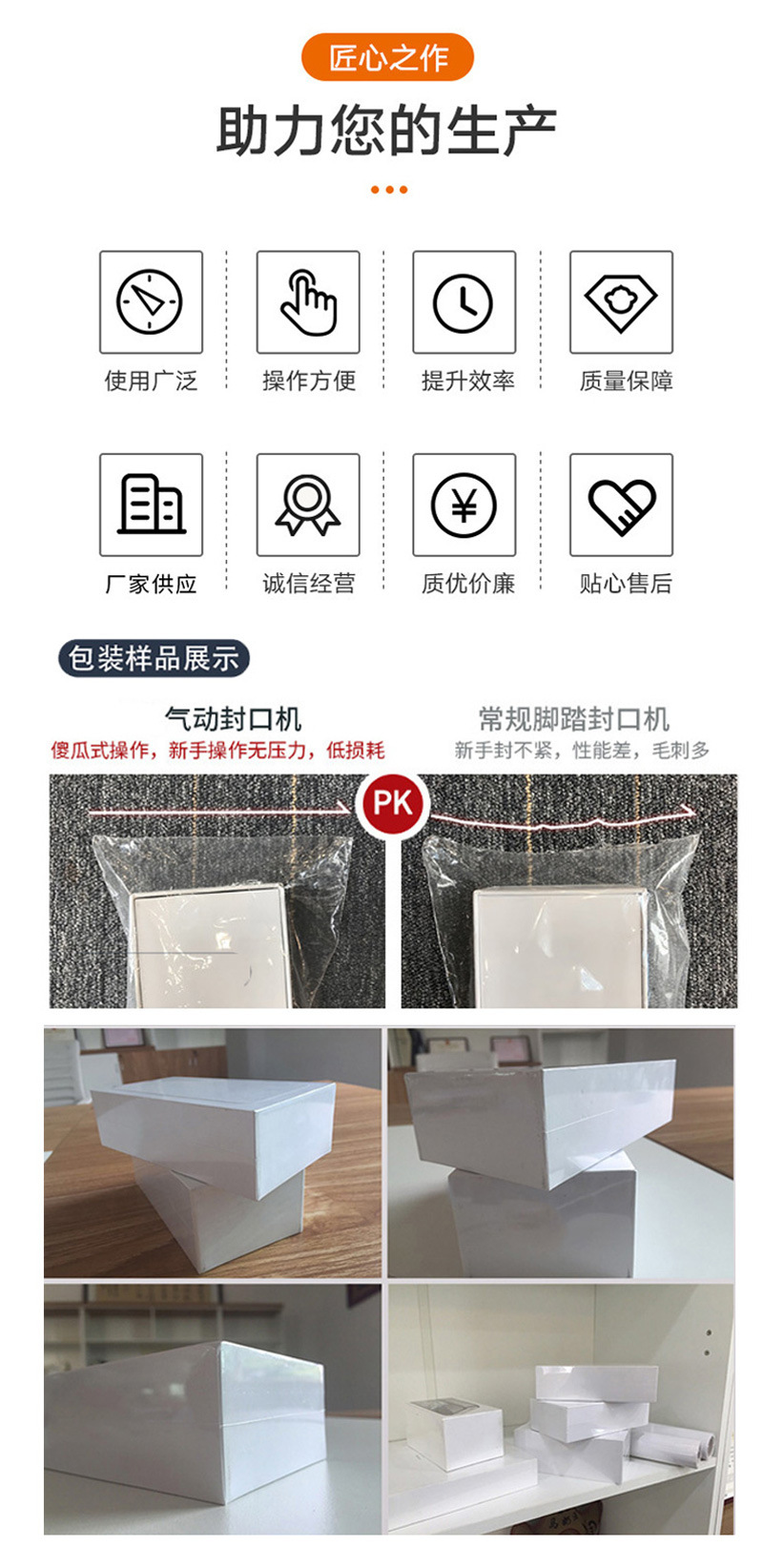 - 氣動封口機應(yīng)放置在干燥、通風(fēng)良好、遠離水源和腐蝕性氣體的環(huán)境中。長期不使用時,用防塵罩罩住設(shè)備,防止灰塵大量堆積;再次啟用前,需先檢查氣路是否通暢、加熱系統(tǒng)是否正常,進行簡單清潔與調(diào)試后再開機。