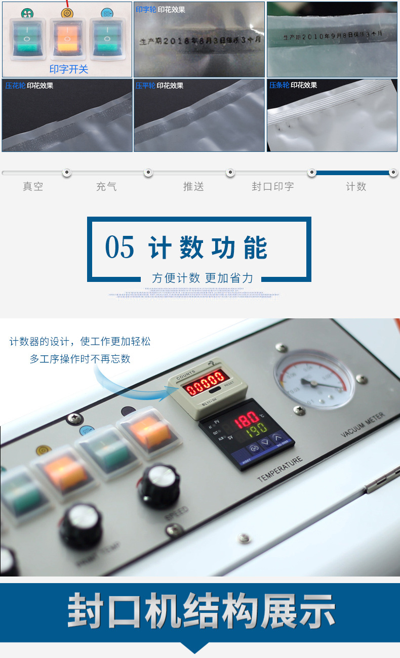 - 自動封口裝置:采用先進(jìn)的熱封技術(shù),封口裝置能夠快速、準(zhǔn)確地對抽真空后的包裝袋進(jìn)行封口,保證封口的牢固性和密封性。封口溫度、壓力和時間等參數(shù)可精確調(diào)節(jié),以適應(yīng)不同材質(zhì)和厚度的包裝材料 。