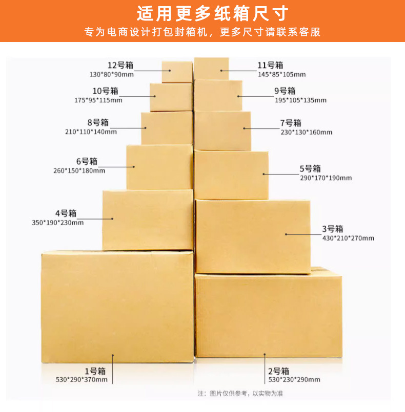 適用范圍 廣泛應(yīng)用在家用電器、紡織、食品、百貨、醫(yī)藥、化工等行業(yè)。產(chǎn)品介紹 快速簡單的調(diào)整兩個(gè)手動(dòng)輪子,完成機(jī)器紙箱尺寸要求的設(shè)置.頂部和底部是同步封起來的(頂部已經(jīng)封起來的紙箱必須引入到機(jī)器中去)