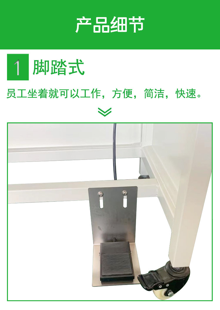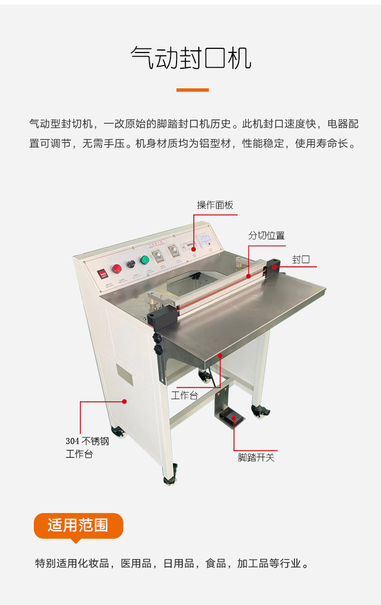 機器采用的是不銹鋼材料制成,利用壓縮空氣作為動力,封口的壓力可以進行調(diào)試,根據(jù)產(chǎn)品的不同選擇合適的壓力指數(shù)。設備穩(wěn)定可靠,可以手動操作也可以腳踏操作,簡單方便。
