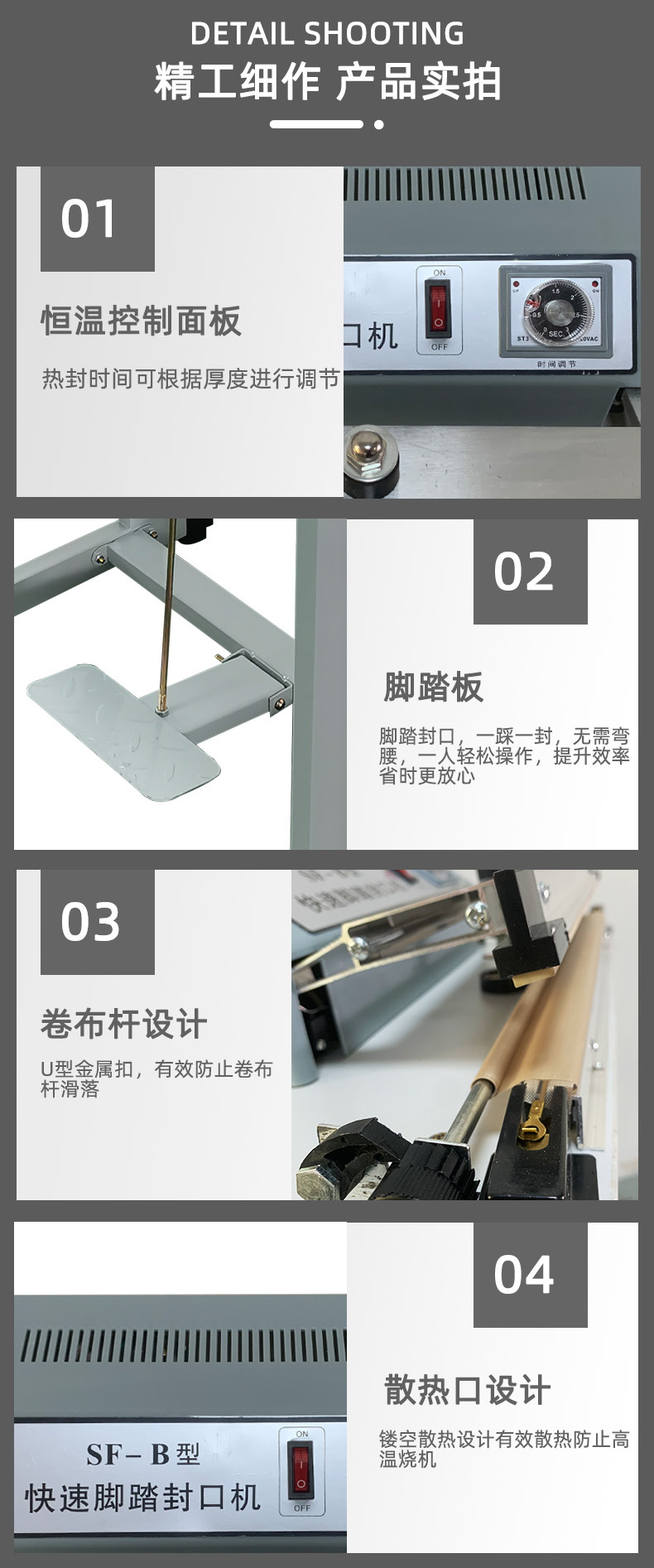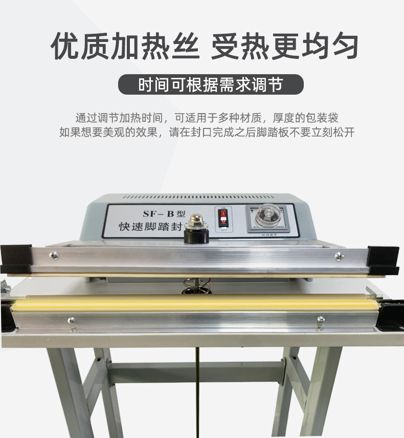 此外,?腳踏封口機(jī)還適用于各種塑料薄膜、?復(fù)合薄膜及鋁塑薄膜的封合,?廣泛應(yīng)用于食品、?土特產(chǎn)、?糖果、?茶葉、?醫(yī)藥、?五金等行業(yè)。?這種設(shè)備的操作簡(jiǎn)單,?加熱時(shí)間可調(diào),?接通電源即可工作,?使得它在商店、?家庭、?工廠等環(huán)境中成為方便且經(jīng)濟(jì)的封口解決方案