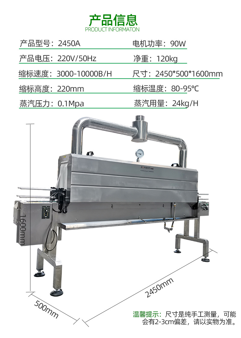 其工作流程通常是先將產(chǎn)品放入經(jīng)過(guò)預(yù)先處理的包裝材料中,然后通過(guò)輸送裝置將其送入充滿高溫蒸汽的收縮室。在蒸汽的作用下,包裝材料迅速收縮并緊密貼合在產(chǎn)品表面。
