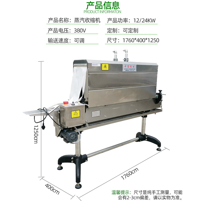 通常由蒸汽發(fā)生器、輸送系統(tǒng)、加熱室和控制系統(tǒng)等部分組成。蒸汽發(fā)生器負(fù)責(zé)產(chǎn)生高溫蒸汽,輸送系統(tǒng)將待包裝物品輸送至加熱室,加熱室內(nèi)的蒸汽使包裝材料收縮,控制系統(tǒng)則用于調(diào)節(jié)設(shè)備的運(yùn)行參數(shù)。