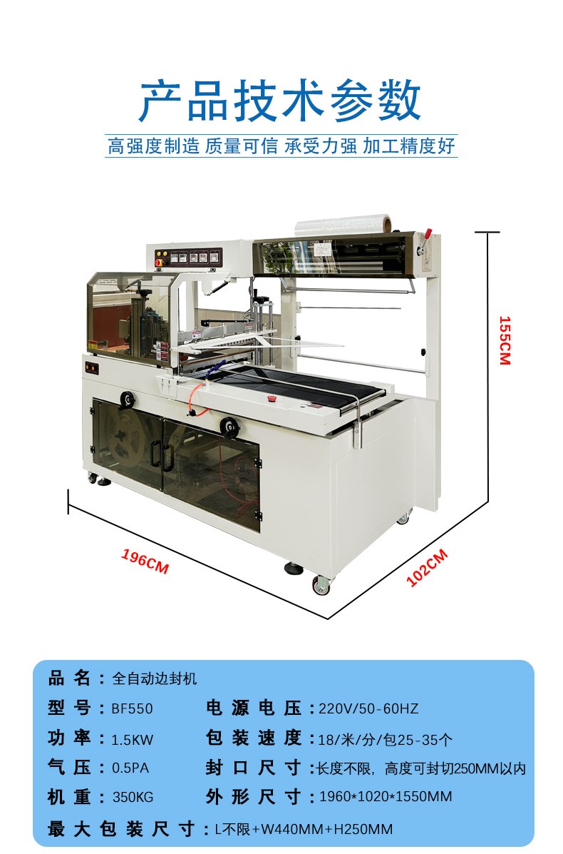 :薄膜的厚度會影響邊封的溫度、壓力和時間等參數(shù)。較厚的薄膜可能需要更高的溫度和更大的壓力來進行封口,而且在熱收縮過程中也可能需要更長的時間或者更高的溫度。因此,在選擇設備時要考慮其是否能夠滿足不同厚度薄膜的包裝要求。
