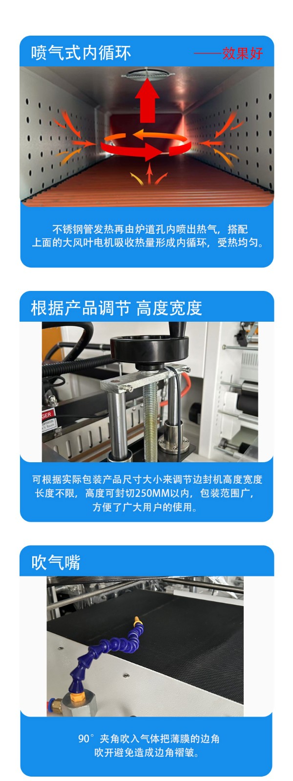 邊封完成后的產品被輸送到熱收縮通道。熱收縮通道內的加熱元件(如電熱管或者紅外加熱裝置)開始工作,產生大量的熱空氣。通風裝置會將熱空氣均勻地分布在通道內,使產品周圍的薄膜能夠均勻受熱。