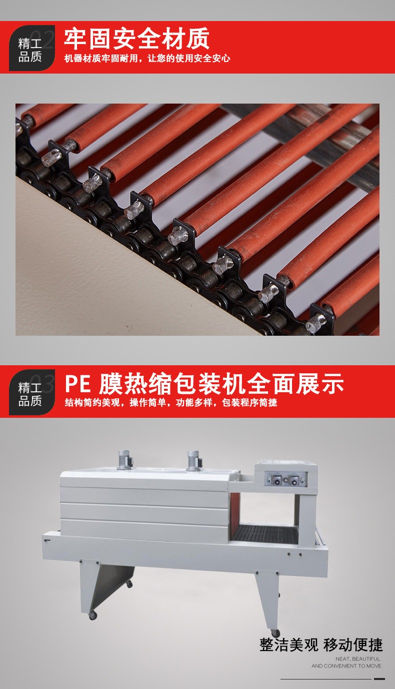 其核心工作原理是熱收縮。機(jī)器內(nèi)部設(shè)有加熱裝置,通常是加熱管,能夠?qū)⒖諝饧訜岬揭欢ǖ臏囟?。?dāng) PE 薄膜包裹產(chǎn)品后,通過輸送帶將產(chǎn)品輸送到加熱區(qū)域。在加熱區(qū)域,熱空氣均勻地吹到 PE 薄膜上,使薄膜分子鏈在熱能的作用下開始運(yùn)動(dòng),分子間的間距減小,從而導(dǎo)致薄膜收縮。例如,當(dāng)溫度達(dá)到 PE 薄膜的收縮溫度范圍(一般在 120 - 180℃左右)時(shí),薄膜會(huì)迅速收縮,貼合在產(chǎn)品的表面。