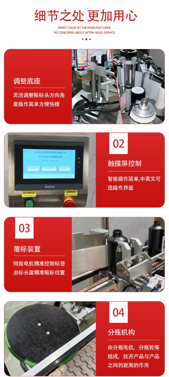 • 貼標(biāo):當(dāng)圓瓶到達(dá)貼標(biāo)位置時(shí),貼標(biāo)機(jī)構(gòu)的標(biāo)簽牽引裝置根據(jù)預(yù)設(shè)的標(biāo)簽長(zhǎng)度,將標(biāo)簽從標(biāo)簽卷上牽引出來(lái),貼標(biāo)頭在控制系統(tǒng)的指令下,將標(biāo)簽準(zhǔn)確地貼附在圓瓶表面。同時(shí),壓標(biāo)裝置對(duì)標(biāo)簽進(jìn)行壓實(shí),使其牢固地粘貼在瓶身上。