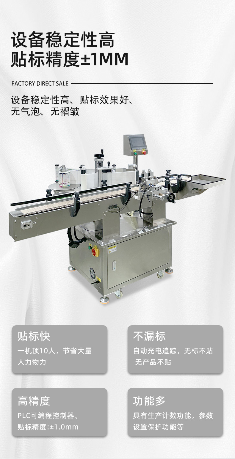 全自動(dòng)圓瓶貼標(biāo)打碼機(jī)是一種集貼標(biāo)和打碼功能于一體的自動(dòng)化設(shè)備,廣泛應(yīng)用于食品、醫(yī)藥、日化等行業(yè)。 以下是其詳細(xì)介紹: 功能特點(diǎn) 貼標(biāo)功能:可在圓瓶的圓周面、圓錐面、雙側(cè)面等位置進(jìn)行貼標(biāo),可貼單標(biāo)或雙標(biāo),正背雙標(biāo)間距可靈活調(diào)整。 打碼功能:可在標(biāo)簽上打印生產(chǎn)日期、批號(hào)、有效期、條形碼、二維碼等信息,滿足不同行業(yè)的標(biāo)識(shí)需求。 自動(dòng)化程度高:采用先進(jìn)的傳感器和控制系統(tǒng),可實(shí)現(xiàn)自動(dòng)送瓶、貼標(biāo)、打碼、收瓶等功能,無(wú)需人工干預(yù),提高生產(chǎn)效率和貼標(biāo)質(zhì)量。 適應(yīng)性強(qiáng):可適應(yīng)不同規(guī)格、形狀的圓瓶,通過(guò)調(diào)整設(shè)備的參數(shù)和更換相