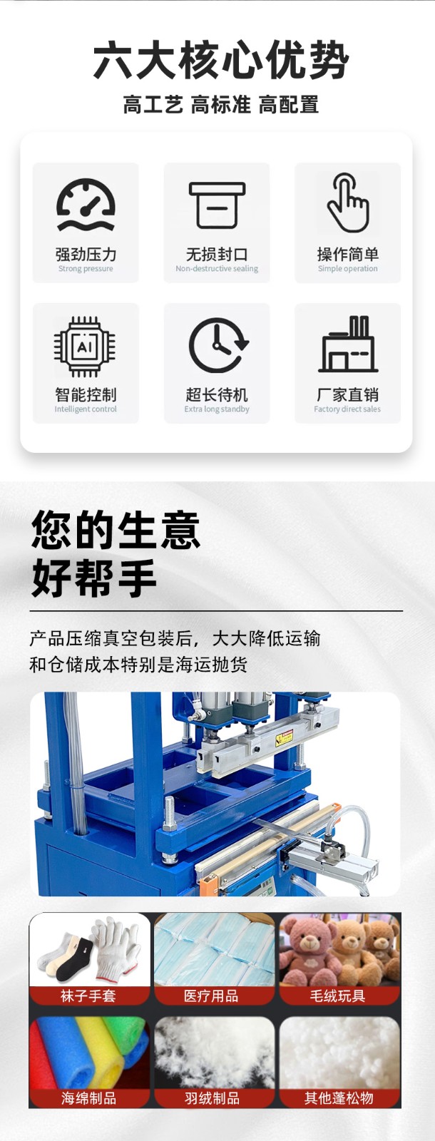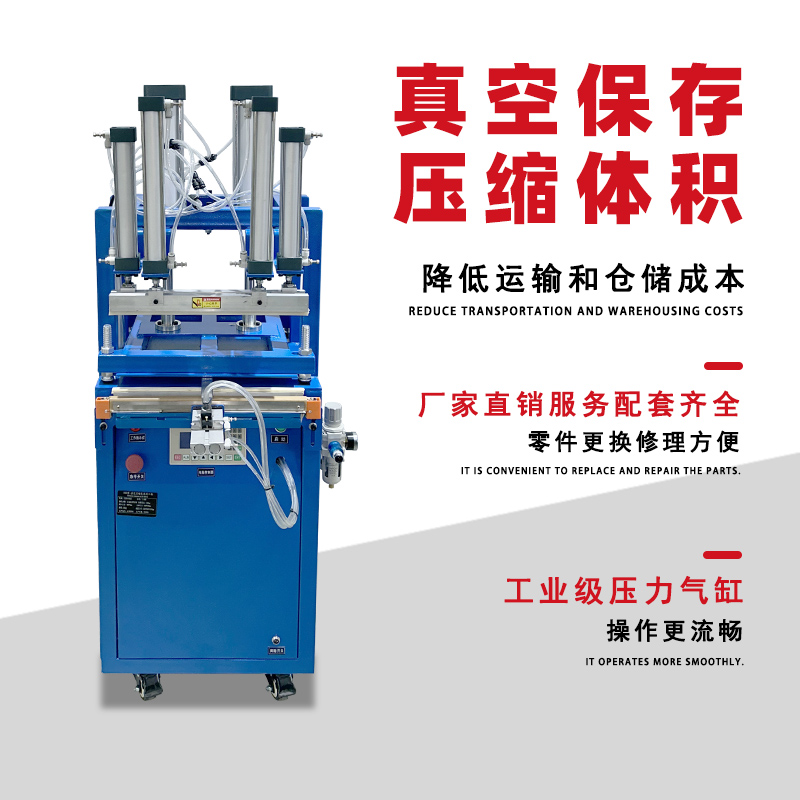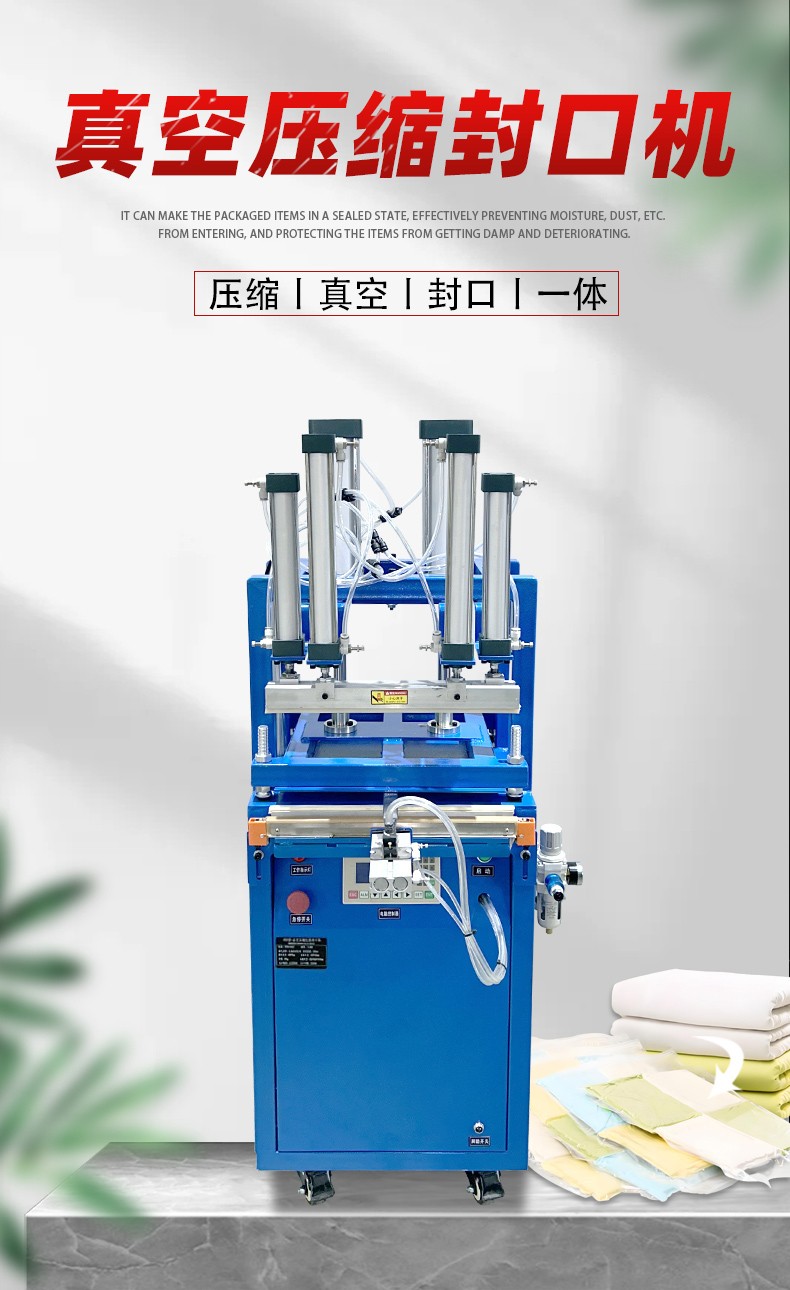 工作原理 抽氣:通過氣嘴或類似裝置,利用真空泵對包裝袋內(nèi)的空氣進(jìn)行抽真空作業(yè),隨著包裝內(nèi)及被包裝物中的空氣被抽出,包裝袋體積減小,從而達(dá)到壓縮包裝物體積的目的。 封口:在抽氣完成后,通過封口作業(yè)將包裝袋口封牢,防止空氣回流,出現(xiàn)漲袋的問題。 壓縮:部分機(jī)型還會采用氣缸壓縮產(chǎn)品的方式,將包裝袋內(nèi)的空氣進(jìn)一步排出去,使得包裝袋內(nèi)部形成 “偽真空狀態(tài)”,從而裹緊產(chǎn)品或包裝件。 性能特點 縮小包裝空間:能極大地縮小蓬松物品的包裝體積,降低儲藏運輸成本。 延長產(chǎn)品保質(zhì)期:包裝后的物品能達(dá)到密封、防潮、防污染等功能,