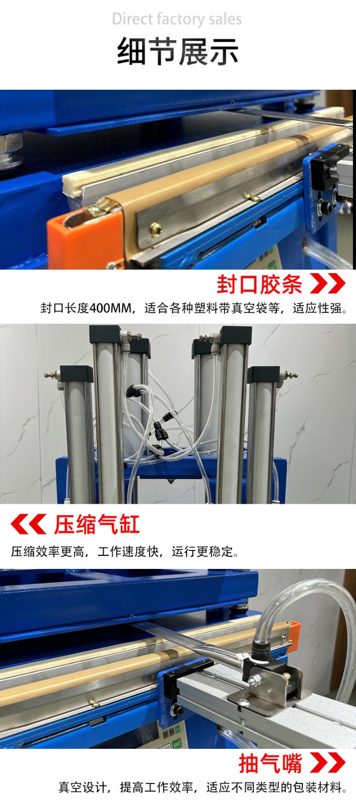 • 壓縮(部分機(jī)型):一些真空壓縮封口機(jī)在抽氣后會利用氣缸等裝置對包裝袋進(jìn)行壓縮,進(jìn)一步排出袋內(nèi)空氣,使被包裝物更加緊實,減小包裝體積。