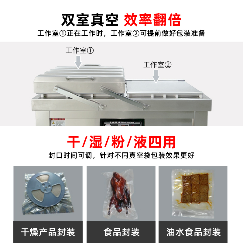 雙室真空包裝機(jī)通過 “雙真空室輪換作業(yè)” 實(shí)現(xiàn)抽真空與裝袋無縫銜接,核心是利用兩個(gè)獨(dú)立真空室的 “時(shí)間差并行操作”,讓設(shè)備在同一周期內(nèi)同時(shí)完成 “抽真空密封” 和 “人工 / 自動(dòng)裝袋”,徹底消除單室機(jī)型 “抽真空時(shí)無法裝袋” 的等待間隙,大幅提升作業(yè)效率。其具體運(yùn)作邏輯和優(yōu)勢(shì)可拆解為以下 3 點(diǎn):