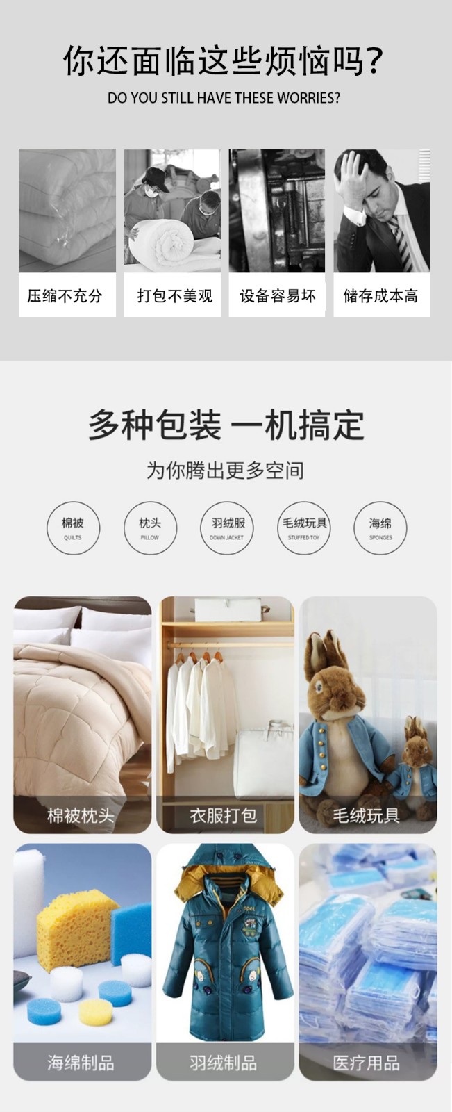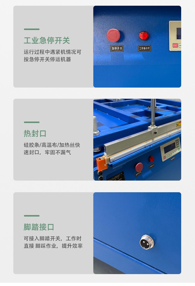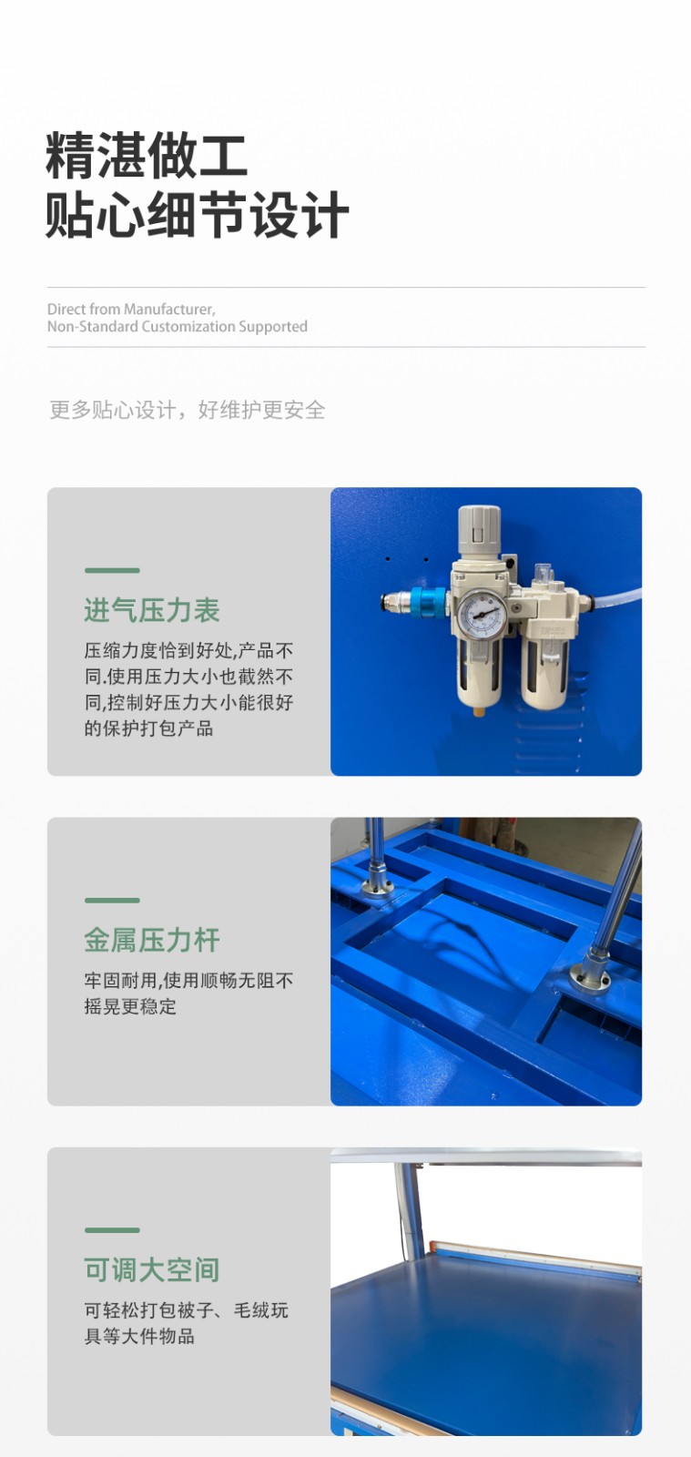 真空壓縮封口機(jī):集成抽真空功能,先抽走包裝內(nèi)空氣(如食品袋、零件袋),再加壓封口,適合需要防潮、保鮮、防氧化的場景(如肉類真空包裝、精密零件防銹包裝)。