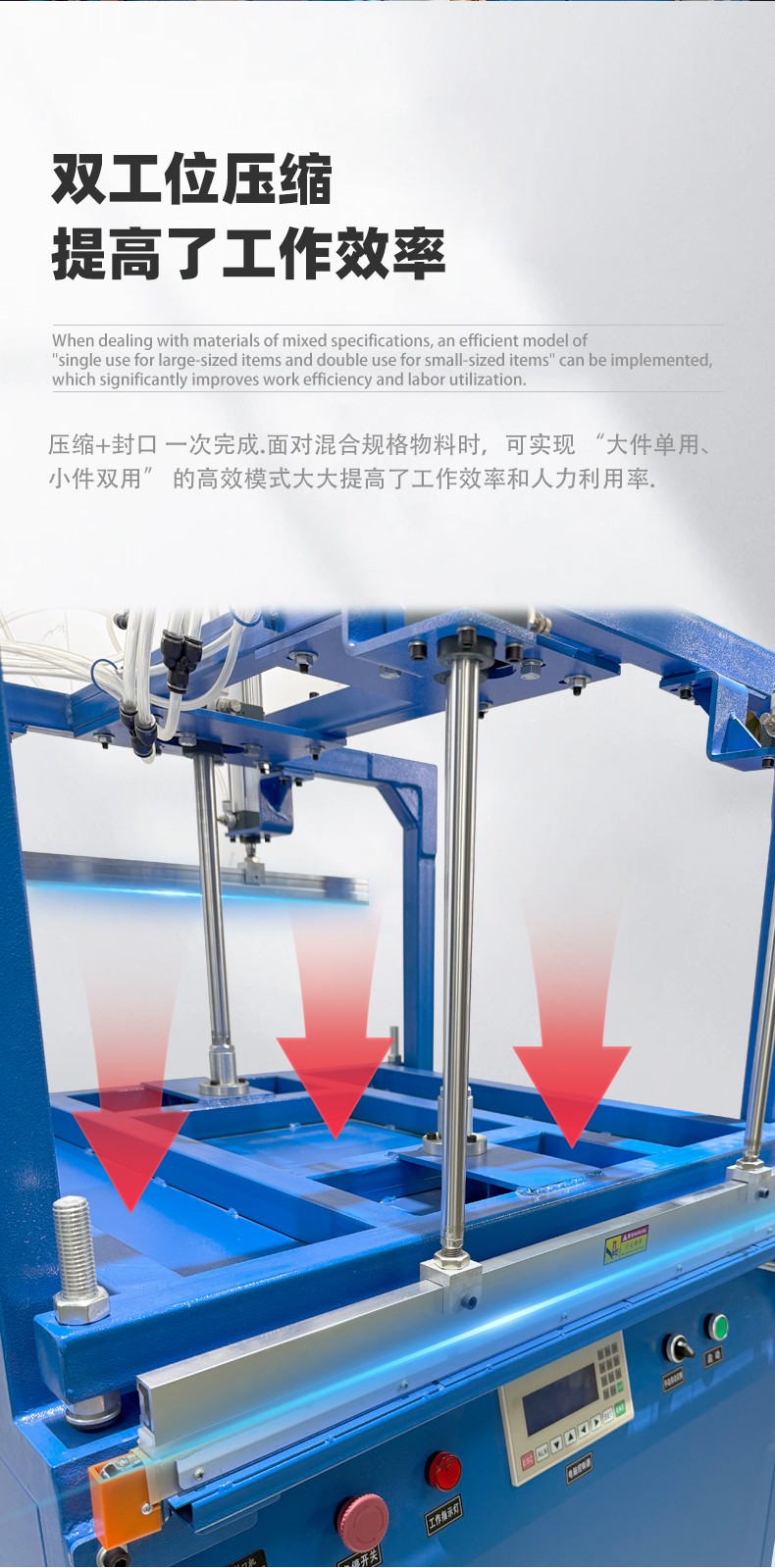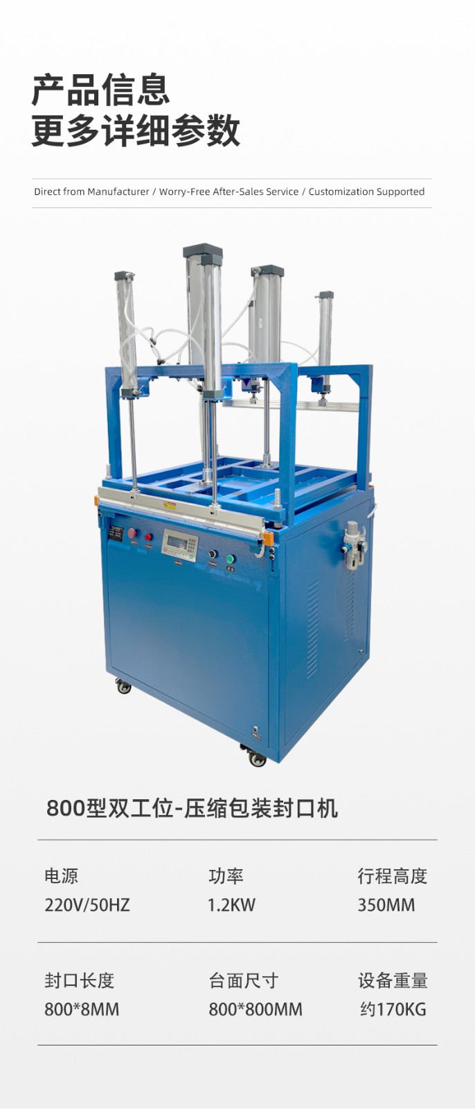 雙工位壓縮封口機(jī):兩個工位可同時作業(yè),一邊封口時另一個可放件 / 取件,適合中小批量、多規(guī)格產(chǎn)品(如多口味食品、電子元件袋),效率比單工位高 50%-80%。