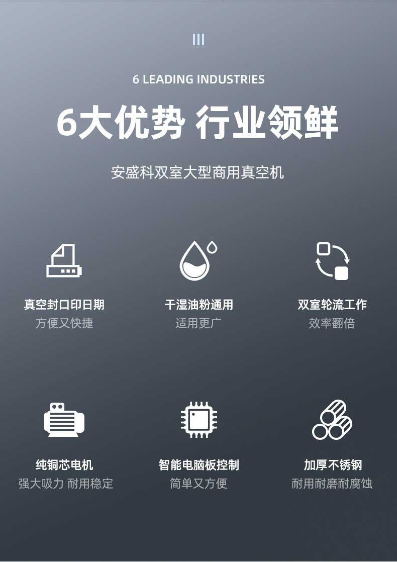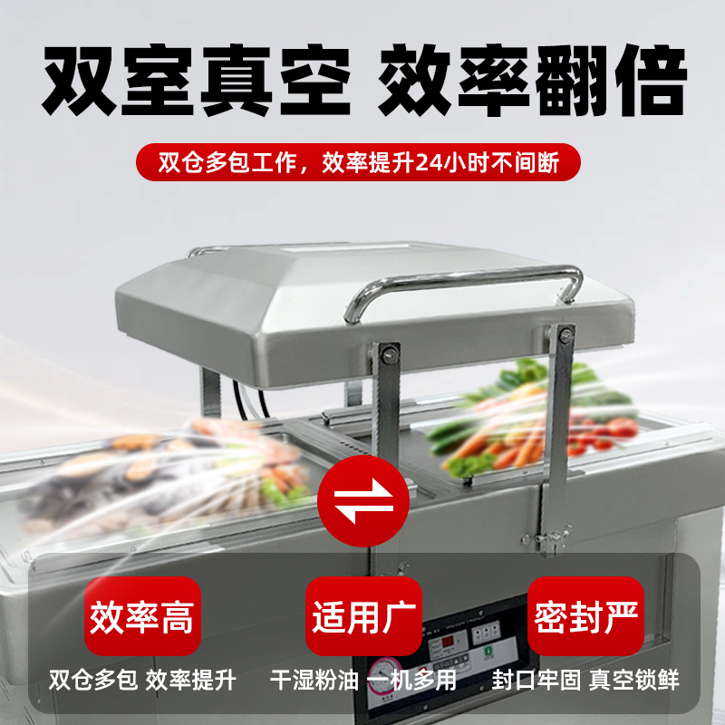 下凹式真空室深度支持定制,產(chǎn)品放置后呈傾斜狀態(tài),抽真空時(shí)湯汁牢牢鎖在凹槽內(nèi),不會(huì)流向封口處;傾斜適配的加熱條與硅膠條緊密貼合,封口平整牢固,杜絕漏封滲漏問(wèn)題。雙室獨(dú)立運(yùn)行設(shè)計(jì),一個(gè)腔室抽真空封口的同時(shí),另一個(gè)腔室可同步擺放待包裝產(chǎn)品,無(wú)縫銜接無(wú)空窗期,包裝效率較單室機(jī)型提升 50% 以上。