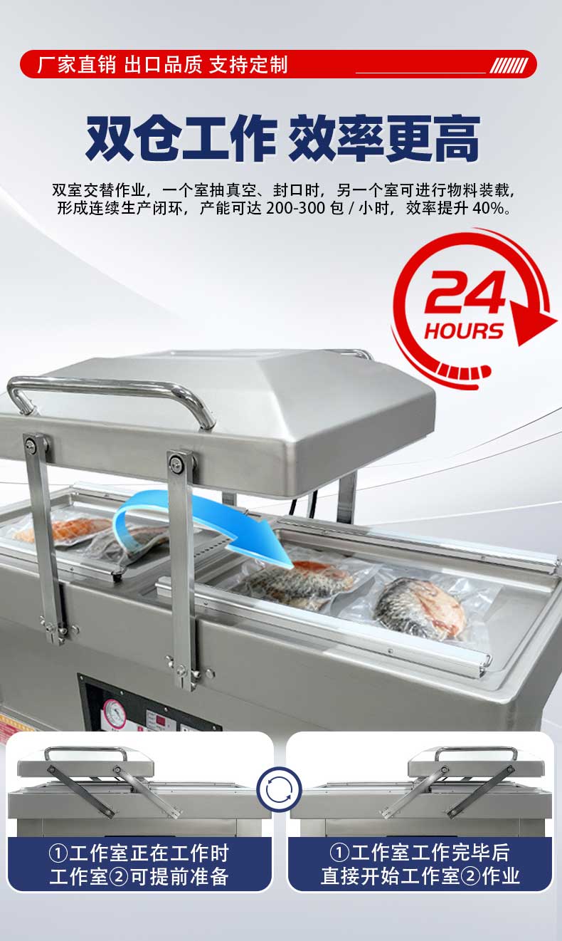 - 雙室設(shè)計(jì):一個(gè)真空室在抽真空時(shí),另一個(gè)真空室可以擺放包裝物,交替工作,節(jié)省操作時(shí)間,提高包裝效率。