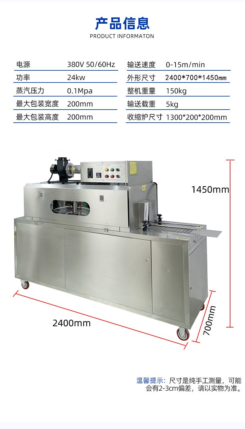 - 智能控溫,適配多類膜材配備 PLC 智能控制系統(tǒng),可精準調(diào)節(jié)蒸汽溫度(50℃-120℃可調(diào))、輸送速度與蒸汽噴射量,兼容 POF、PVC、PE 等多種熱收縮膜材,滿足不同產(chǎn)品的包裝厚度與質(zhì)感要求。