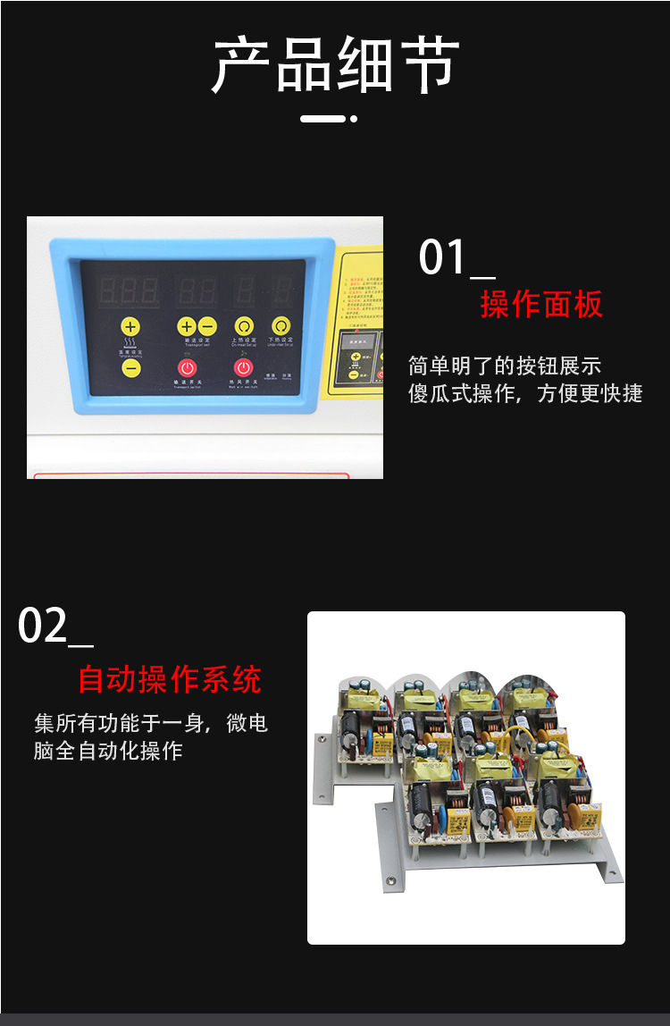 PRODUCT CENTER熱收縮機(jī)的使用非常簡單,只需將產(chǎn)品放入收縮機(jī)中,調(diào)整好溫度和時(shí)間,即可完成收縮包裝。此外,收縮機(jī)還帶有自動(dòng)計(jì)數(shù)功能,可以準(zhǔn)確計(jì)算出包裝數(shù)量,提高您的生產(chǎn)效率。