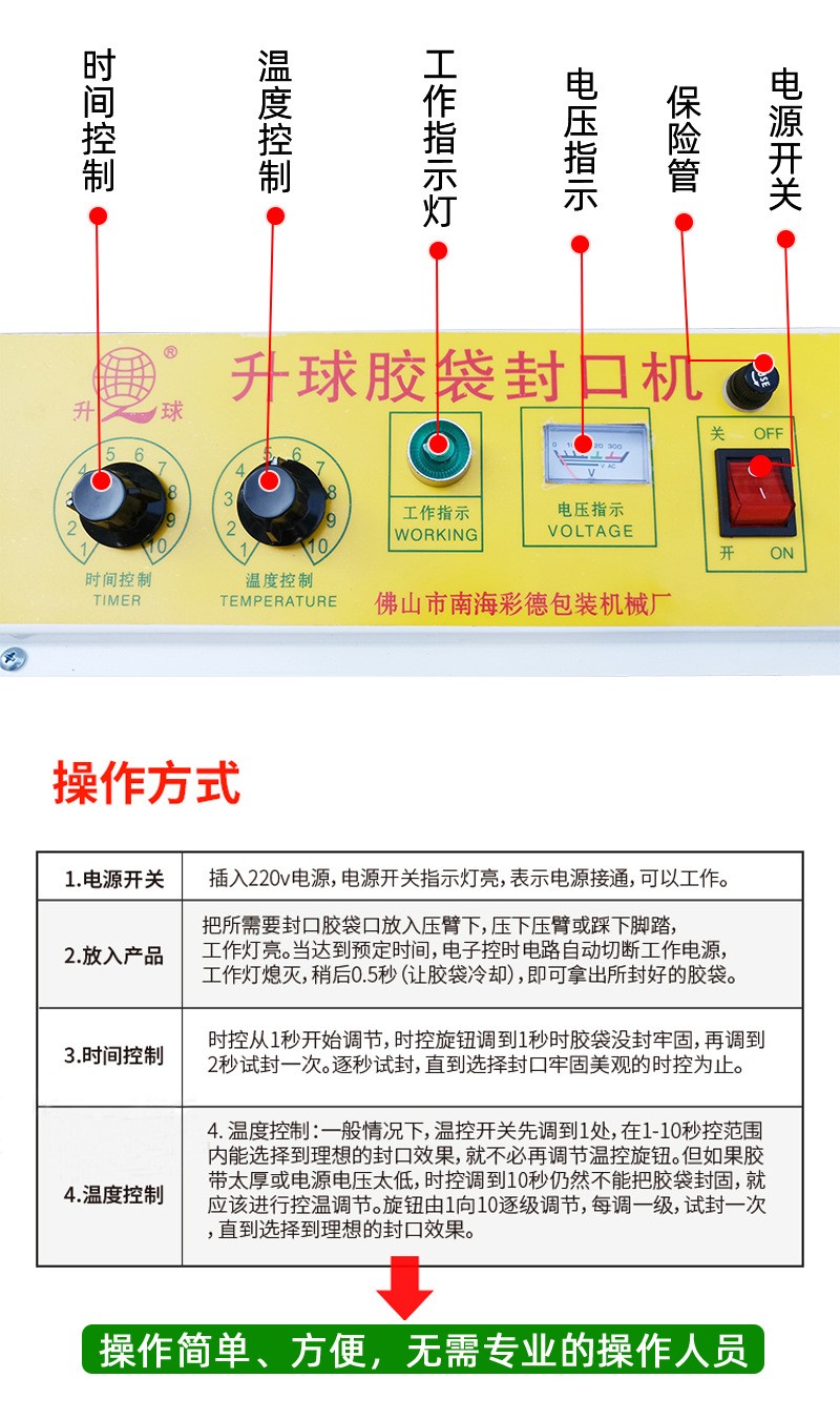 腳踏封口機(jī)利用電氣脈沖技術(shù),使原有的工作時間從2-4秒縮短為0.2秒,是一種投資少,效益高,封口長度長,操作簡單,含專利的高效益封口設(shè)備,能廣泛用于食品,醫(yī)藥,土特產(chǎn),電器軟件,工廠,商店,服務(wù)行業(yè)。