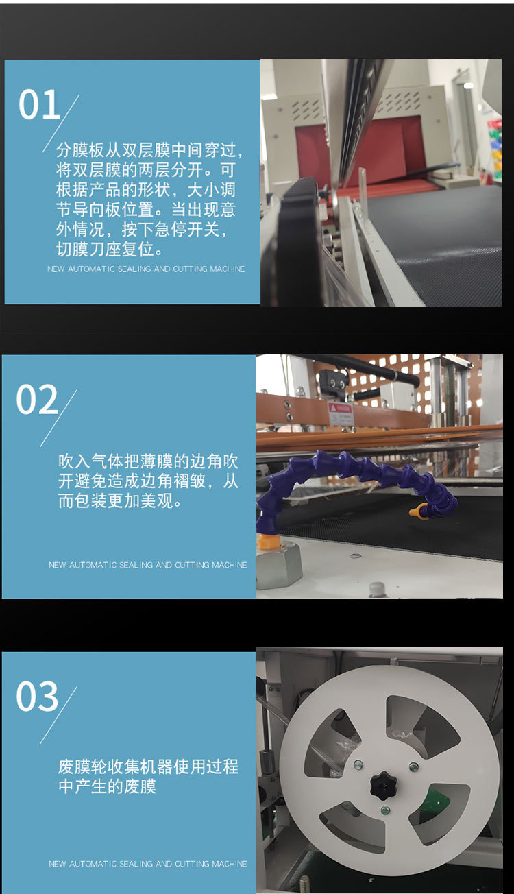 封切機(jī)是全自動無人化操作的包裝機(jī),廣泛用于批量生產(chǎn)包裝的流水作業(yè),工作效率高,自動送膜打孔,自動套膜封切,自動卷取廢料;只需手動調(diào)節(jié)導(dǎo)膜系統(tǒng)以及手動調(diào)節(jié)進(jìn)料輸送平臺,適用不同寬度及高度的產(chǎn)品。