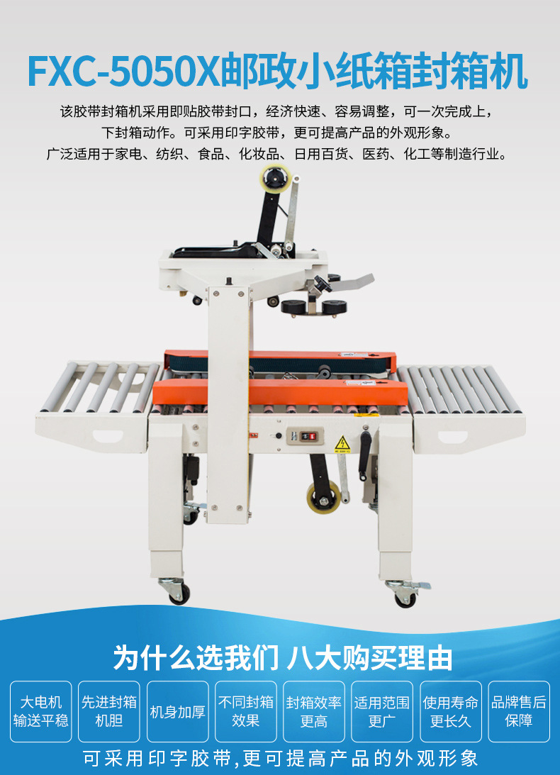 封箱機(jī)主要適用于紙箱的封箱包裝,既可單機(jī)作業(yè),也可與流水線配套使用,它可單箱作業(yè),也可與紙箱成型開箱機(jī)、裝箱機(jī)、貼標(biāo)機(jī)、捆包機(jī)、棧板堆疊機(jī)、輸送機(jī)等設(shè)備配套成包裝流水線使用,為包裝流水線作業(yè)必須的設(shè)備。